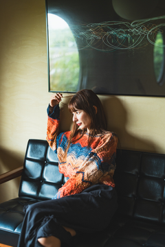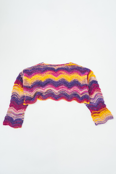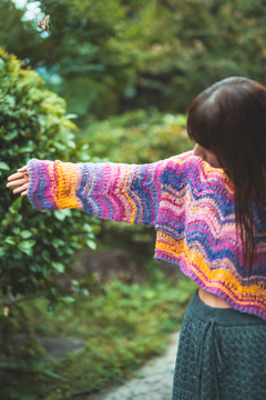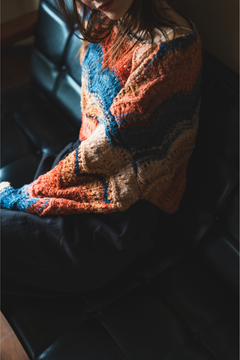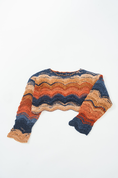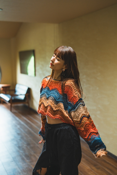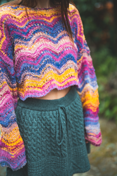 かすりの糸でオリジナルの編み柄で編んだショート丈のニットプルオーバー。
