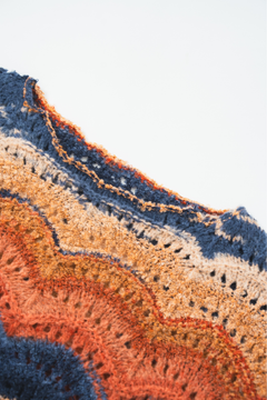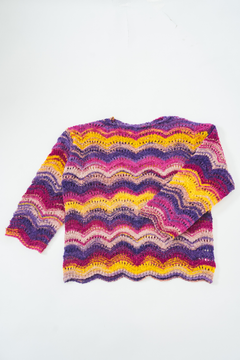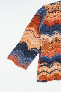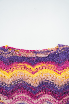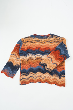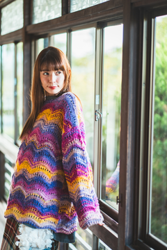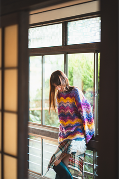 かすりの糸でオリジナルの編み柄で編んだユニセックスで着用可能なビッグサイズのニットプルオーバー。1点1点アイテムの中でパーツの配色が異なるのもポイント。